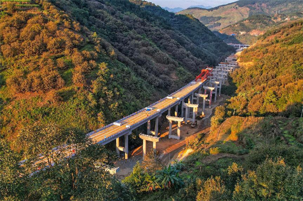 隆林樞紐立交橋,從航拍圖上看,通向四方的幾條匝道像是龍爪,主線似龍身,組成了猶如盤踞在山間的“龍”。在架設(shè)匝道T梁時,按照施工組織設(shè)計,T梁從D匝道推進(jìn)到上跨汕昆高速公路單獨的鋼箱梁吊架是已經(jīng)合龍的。但架梁展開時意外出現(xiàn),鋼箱梁因其他原因未能到位——似乎成了考驗魏玉“虎”能否撼動這條“龍”的試金石。魏玉虎應(yīng)急預(yù)案祭出:運梁車把T梁運到鋼箱梁附近,吊車把3跨梁吊架到鄰近D匝道的A匝道上,架橋機(jī)通過過渡工程,在A匝道繼續(xù)架梁;A匝道就成為關(guān)鍵線路,項目部立即集中火力搶做A匝道上的橋墩,確保架梁能繞道繼續(xù)前進(jìn)。這可以說“虎”勝“龍”。