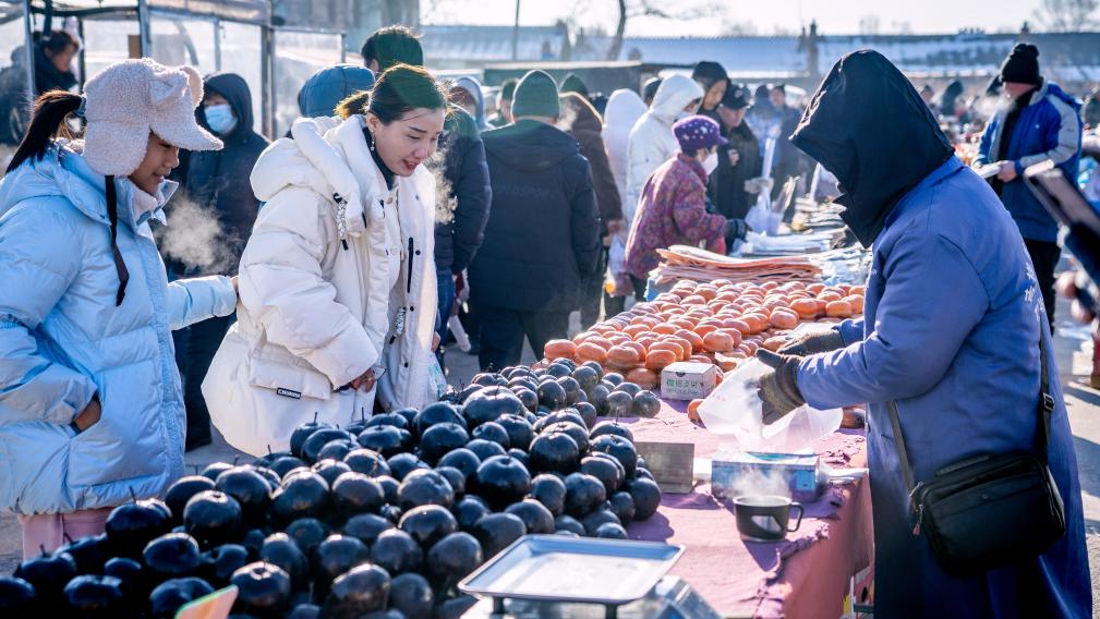 “凍梨凍柿子嘞,嘎嘎甜,不甜不要錢”“冰糖心蘋果賤賣嘍,3斤10塊”“排骨18塊1斤,棒骨8塊1斤”……臨近年關,吉林省長春市近郊的卡倫大集上,人群摩肩接踵,叫賣聲此起彼伏。這個中國東北農村集市年味漸濃。