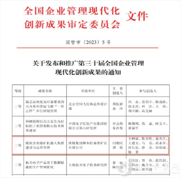 西部決策網(wǎng)訊 近期,全國企業(yè)管理現(xiàn)代化創(chuàng)新成果審定委員會印發(fā)《關(guān)于發(fā)布和推廣第三十屆全國企業(yè)管理現(xiàn)代化創(chuàng)新成果的通知》。檸條塔礦業(yè)公司管理創(chuàng)新成果《煤炭企業(yè)煤礦機器人集群建設(shè)與運營管理》獲二等獎,是陜煤集團所屬煤炭生產(chǎn)企業(yè)唯一一家獲獎單位。