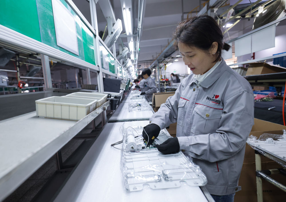 2月19日,工人在位于浙江金華市金義新區(qū)的浙江好易點(diǎn)科技股份有限公司車間內(nèi)組裝智能晾衣機(jī)。據(jù)介紹,該公司已形成年產(chǎn)智能晾衣機(jī)100萬(wàn)套生產(chǎn)能力。新華社記者 徐昱 攝
