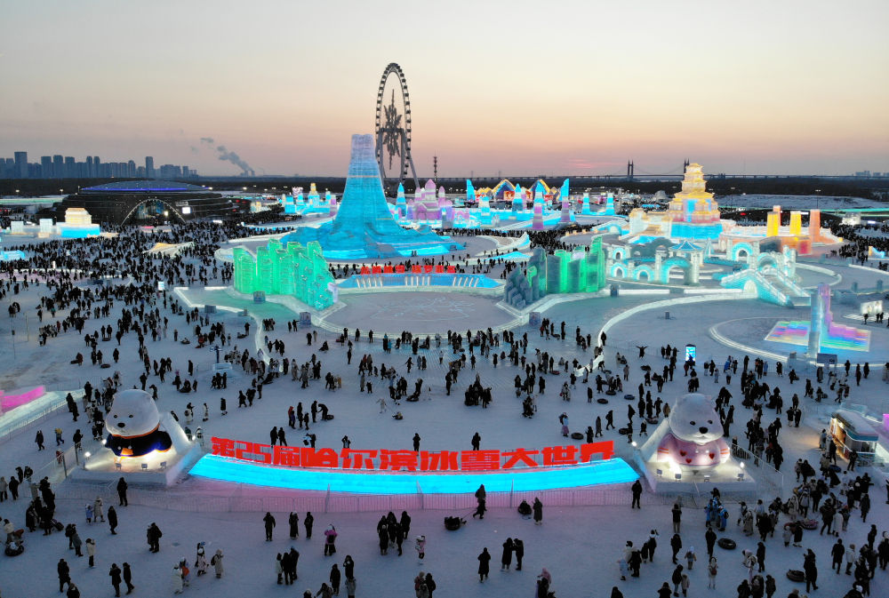 2024年2月15日,游客在哈爾濱冰雪大世界園區(qū)內游玩(無人機照片)。新華社記者 王建威 攝