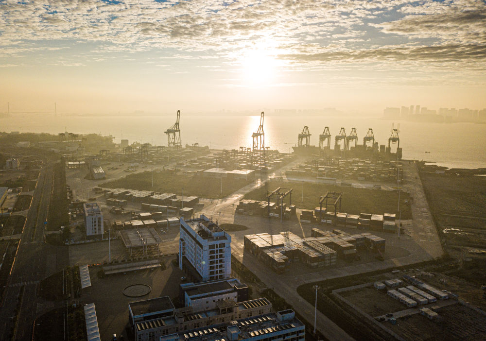 2024年1月1日在海南省洋浦經(jīng)濟(jì)開(kāi)發(fā)區(qū)拍攝的海南自貿(mào)港集裝箱航運(yùn)樞紐——洋浦國(guó)際集裝箱碼頭(無(wú)人機(jī)照片)。新華社記者 蒲曉旭 攝