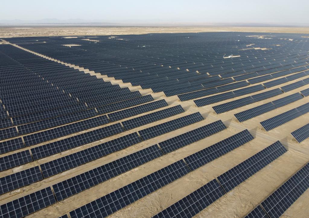 這是2023年9月拍攝的中國石油塔里木油田尉犁縣10萬千瓦光伏發(fā)電項(xiàng)目(無人機(jī)照片)。新華社記者郝建偉 攝